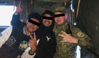 Latvia says this image shows a Belarusian service member posing with migrants in a military vehicle (Image: Latvia Ministry of Defence) Belarus has been accused of pushing migrants across its border with Latvia More...